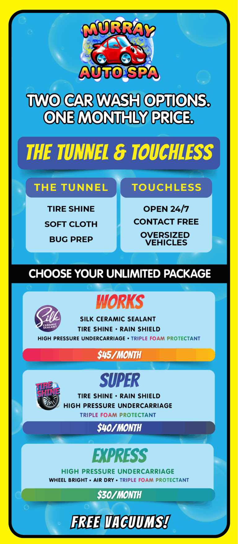 Each car is prepped before entering our 65-foot soft cloth, state of the art technology, tunnel. In three minutes, your car can go from dirty to clean. We can accommodate compact cars to SUVs to single wheel trucks. Our washes range from $10 to $25 individually or if you enjoy keeping your vehicle clean, you can join our unlimited monthly VIP club for $30 to $45 per month. This allows you to wash as many times as you want in a month for one low price.
